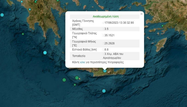Σεισμική δόνηση μεγέθους 3,5 βαθμών της κλίμακας Ρίχτερ έγινε σήμερα πριν από λίγο στην Κρήτη.