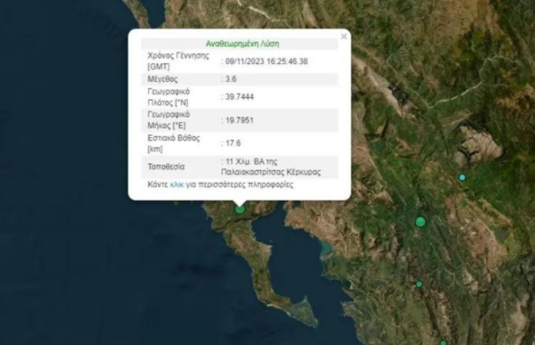 Σεισμός 3,6 Ρίχτερ σημειώθηκε σήμερα το απόγευμα στην Κέρκυρα. Με βάση την αναθεωρημένη λύση του Γεωδυναμικού Ινστιτούτου, το εστιακό βάθος υπολογίζεται στα 17,6 χλμ.