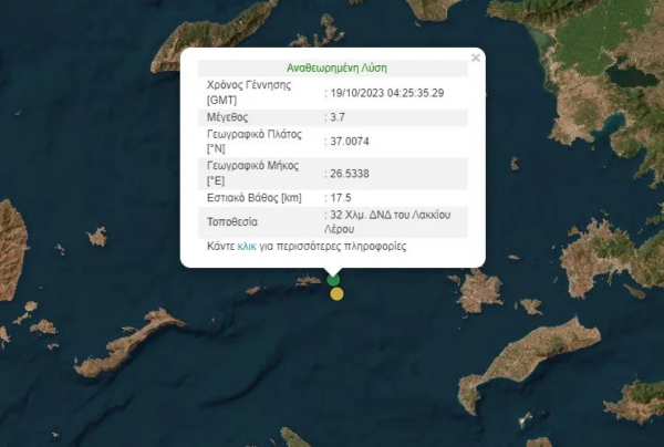 Σεισμός 3,7 βαθμών την κλίμακας Ρίχτερ σημειώθηκε σήμερα τα ξημερώματα ανοικτά της Λέρου.