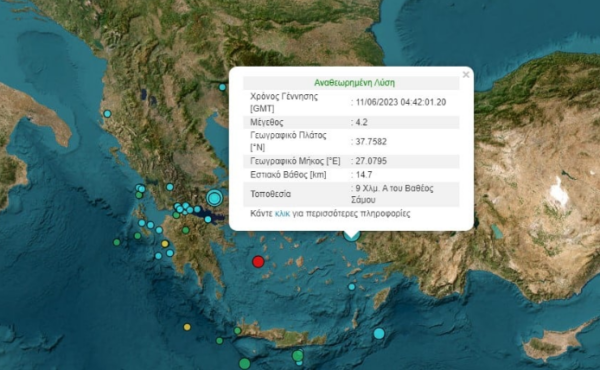 Σεισμός τώρα 4,2 Ρίχτερ στη Σάμο, 9 χιλιόμετρα ανατολικά από την πρωτέυουσα, το Βαθύ.