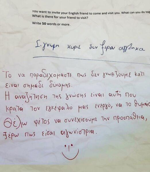 Συγκινητικό είναι το απολογιτικό μήνυμα μαθήτριας στον δάσκαλο Αγγλικών, επειδή δεν έγραψε στο τεστ Αγγλικών που τους έβαλε.