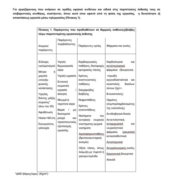 Για εργαζόμενους που ανήκουν σε ομάδες υψηλού κινδύνου και ειδικά στις περιπτώσεις έκθεσής τους σε επιβαρυντικές συνθήκες, συστήνεται, όπου αυτό είναι εφικτό από τη φύση της εργασίας, η δυνατότητα εξ αποστάσεως εργασία μέσω τηλεργασίας