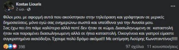 «Φίλοι μου, με αφορμή αυτά που ακούστηκαν στην τηλεόραση και γράφτηκαν σε μερικές δημοσιεύσεις, μόνο εγώ σας ενημερώνω σωστά και υπεύθυνα για την Ανυσία μου. Σας έχω πει ότι πάμε καλύτερα αλλά ποτέ δεν ήταν σε κώμα. Διασωληνωμένη σε καταστολή ήταν και παραμένει διασωληνωμένη αλλά σε ήπια καταστολή. Οικογένεια και γιατροί είμαστε συγκρατημένα αισιόδοξοι. Έχουμε πολύ δρόμο ακόμα!!! Με εκτίμηση Λιούρης Κωνσταντίνος!!!!!» έγραψε ο πατέρας της 25χρονης Ανυσίας.