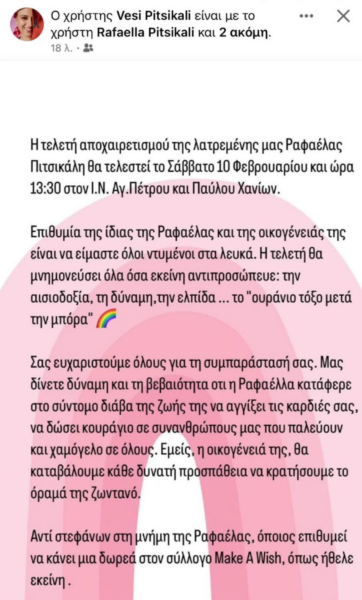 Στην ανακοίνωση η οικογένεια αναφέρει ότι επιθυμία της 21χρονης είναι αντί στεφάνων να δοθούν χρήματα για να στηριχθεί το Make a Wish.