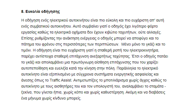 Λίγες γραμμές πιο πάνω, γίνεται σαφής αποτύπωση του καλύτερου συστήματα πέδησης που διαθέτουν τα ηλεκτροκίνητα, καθώς όταν ο οδηγός αφήνει το γκάζι, αυτομάτως επιβραδύνουν σε ικανοποιητικό βαθμό, σε αντίθεση με τα περισσότερα αυτοκίνητα συμβατικών κινητήρων. Αυτό όμως τι σημαίνει; Ότι ο οδηγός θα έχει τη δυνατότητα να διαβάσει ένα μήνυμα χωρίς να υπάρχει κίνδυνος; Μάλλον λίγο οξύμωρη η τελευταία πρόταση της όγδοης απάντησης και προκαλεί ερωτήματα το πώς κάτι τέτοιο είναι «επιστημονικά τεκμηριωμένο». Καλό θα ήταν να μην παροτρύνονται οι οδηγοί να διαβάζουν μηνύματα ενώ βρίσκονται πίσω από το τιμόνι, ιδιαίτερα σε μια χώρα που αναδεικνύεται πρωταθλήτρια στα τροχαία δυστυχήματα.