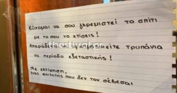 “Εύχομαι να σου γκρεμιστεί το σπίτι με το που το χτίσεις! Απαράδεκτο να χρησιμοποιείτε τρυπάνια σε περίοδο εξεταστικής! Με εκτίμηση ένας φοιτητής που δεν τον σέβεσαι!”, έγραψε ο φοιτητής στο σημείωμα που δημοσίευσε το thestival.gr και έκανε τον γύρο των social media.