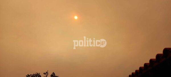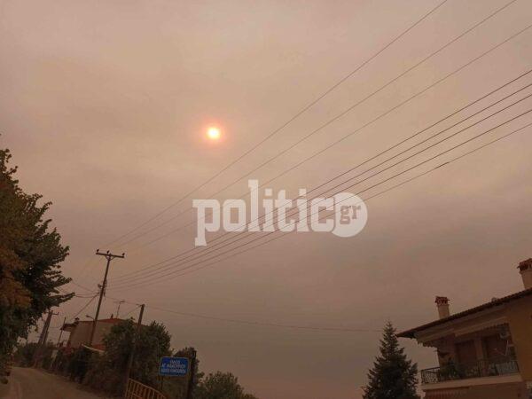 Παράλληλα λόγω της πυρκαγιάς η ατμόσφαιρα στον Πολύγυρο και τη γύρω περιοχή είναι θολή και ο ήλιος έχει κρυφτεί καθώς ο ουρανός έχει καλυφθεί από καπνούς.