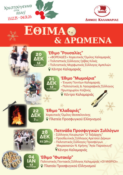 Στο πλαίσιο των χριστουγεννιάτικων εκδηλώσεων του Δήμου Καλαμαριάς, αναβιώνουν παραδοσιακά δρώμενα με βαθιές ρίζες στην κοινωνία, στα ήθη και τα έθιμα του τόπου μας. Έθιμα που έφθασαν μέχρι σήμερα από τη Μακεδονία, τον Πόντο και την Μικρασία, μεταφέροντας αξίες, συμβολισμούς και το αυθεντικό πνεύμα των ημερών.