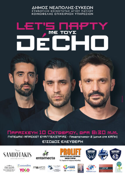 Ένα κεφάτο πάρτι με live ελληνική και ξένη μουσική από τους De’cho, και πολύ χορό είναι ήδη προγραμματισμένο για την Παρασκευή 10 Οκτωβρίου..