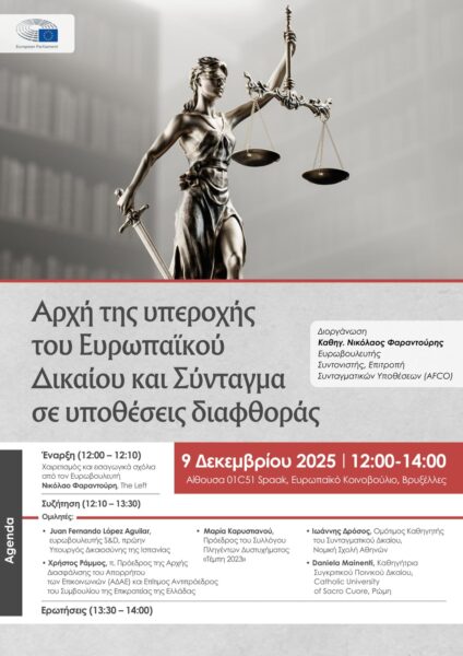Η εκδήλωση θα πραγματοποιηθεί την ερχόμενη Τρίτη 9 Δεκεμβρίου 2025 στις Βρυξέλλες και θα εστιαστεί στο ρόλο του Ευρωπαϊκού Δικαίου έναντι διατάξεων.