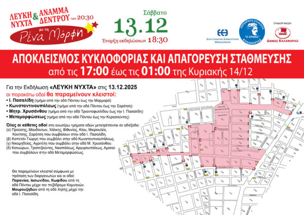 Οδοί που θα παραμείνουν κλειστές το Σάββατο 13.12.2025, 17:00–01:00