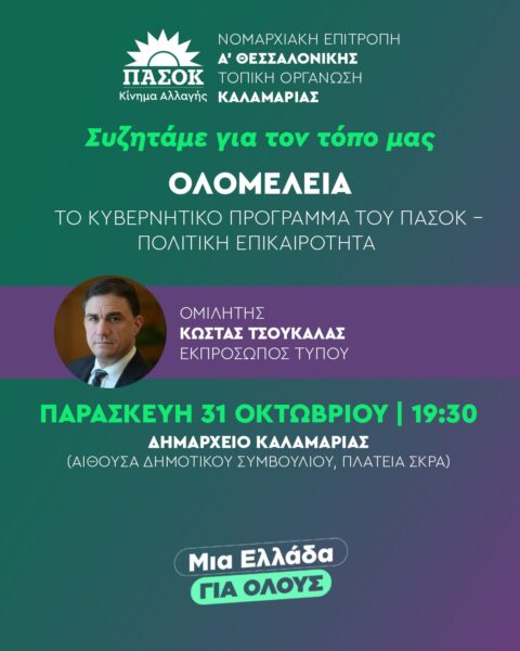 Η Νομαρχιακή Επιτροπή Α’ Θεσσαλονίκης του ΠΑΣΟΚ – Κινήματος Αλλαγής και η Τοπική Οργάνωση Καλαμαριάς διοργανώνουν ολομέλεια με θέμα «Το κυβερνητικό πρόγραμμα του ΠΑΣΟΚ – Πολιτική επικαιρότητα», την Παρασκευή 31 Οκτωβρίου στις 19:30, στο Δημαρχείο Καλαμαριάς (αίθουσα Δημοτικού Συμβουλίου, Πλατεία Σκρα).