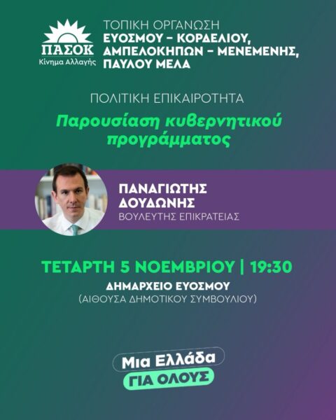 Η Τοπική Οργάνωση ΠΑΣΟΚ – Κίνημα Αλλαγής Ευόσμου – Κορδελιού, Αμπελοκήπων – Μενεμένης, Παύλου Μελά διοργανώνει εκδήλωση πολιτικής επικαιρότητας με θέμα «Παρουσίαση κυβερνητικού προγράμματος».