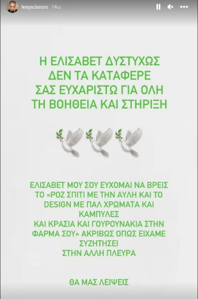 «Η Ελισάβετ δυστυχώς δεν τα κατάφερε. Σας ευχαριστώ για όλη τη βοήθεια και στήριξη. Ελισάβετ μου σου εύχομαι να βρεις το ροζ σπίτι με την αυλή και το ντιζάιν με παλ χρώματα και καμπύλες και κρασιά και γουρουνάκια στη φάρμα σου, ακριβώς όπως είχαμε συζητήσει στην άλλη πλευρά. Θα μας λείψεις».