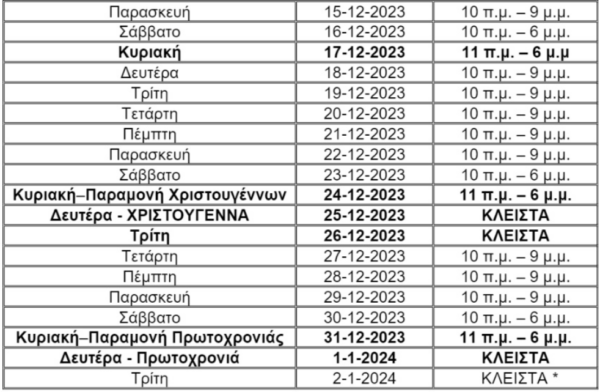 Τα καταστήματα λειτούργησαν έως και την Παραμονή Χριστουγέννων (24/12), ενώ λόγω των εορτών έμειναν κλειστά την ημέρα των Χριστουγέννων και θα μείνουν και σήμερα.