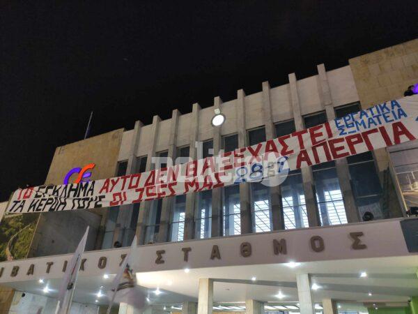 Σημειώνεται ότι αναρτήθηκε μεγάλο πανό στην είσοδο του ΟΣΕ, με μήνυμα για τον έναν χρόνο από το έγκλημα των Τεμπών.
