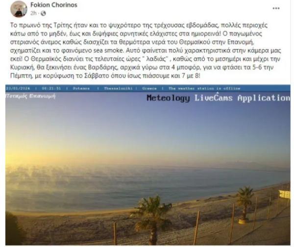 «Ο παγωμένος στεριανός άνεμος, καθώς διασχίζει τα θερμότερα νερά του Θερμαϊκού στην Επανομή, σχηματίζει και το φαινόμενο “sea smoke”» αναφέρθηκε στην ανάρτηση του Weather Analysis Greece.