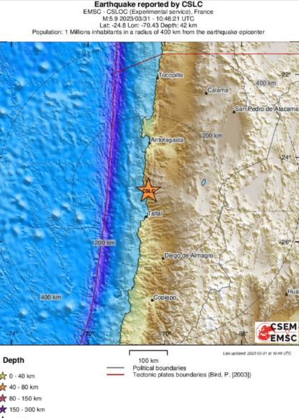 Το επίκεντρο του σεισμού εντοπίζεται 59 χιλιόμετρα νοτιοδυτικά της πόλης Κονστιτουσιόν και το εστιακό βάθος υπολογίζεται σε 12 χιλιόμετρα. Μέχρι στιγμής δεν υπάρχουν αναφορές για θύματα ή σοβαρές υλικές ζημιές.