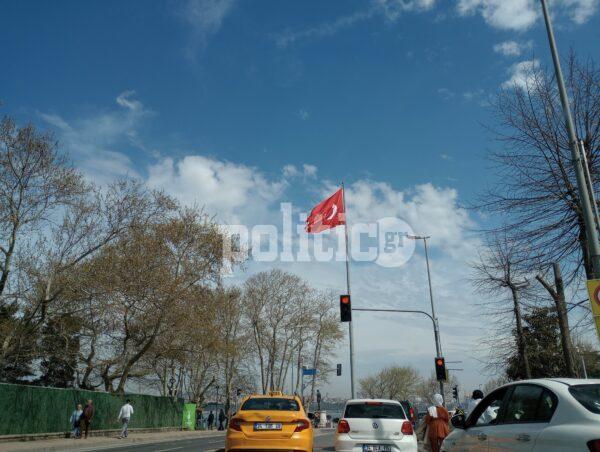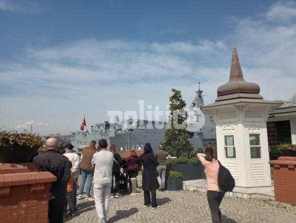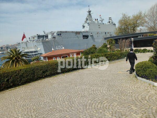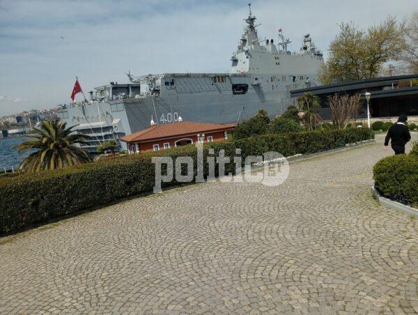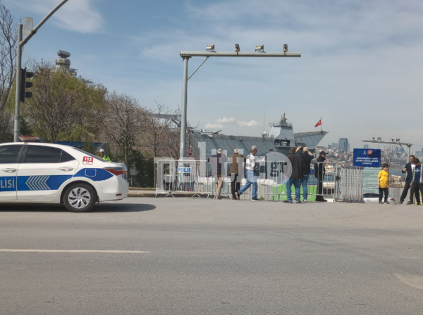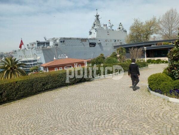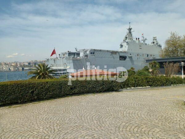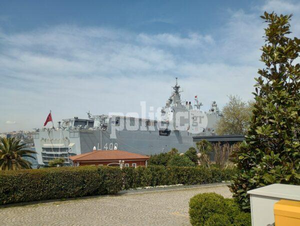 Η ναυαρχίδα του τουρκικού Πολεμικού Ναυτικού, το ελικοπτεροφόρο πλοίο αμφίβιων επιχειρήσεων, TCG Anadolu, είναι αποκλεισμένο με κορδέλες και απαγορεύεται αυστηρά η προσέγγισή του από τον κόσμο. Ωστόσο, πολλοί είναι αυτοί που προσπαθούν να το φωτογραφήσουν καθώς οι εικόνες λόγω του όγκου του είναι εντυπωσιακές.