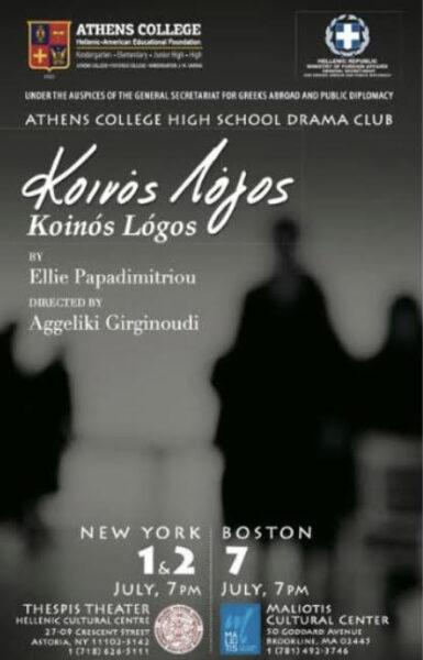 Στο Ελληνικό Πολιτιστικό Κέντρο «Θέσπις», της Νέας Υόρκης, παρουσιάζεται σήμερα η παράσταση του θεατρικού ομίλου του Λυκείου του Κολλεγίου Αθηνών, «Κοινός λόγος», στο πλαίσιο των εκδηλώσεων μνήμης για την επέτειο των 100 ετών από τη Μικρασιατική καταστροφή, που διοργανώνει η Αρχιεπισκοπή Αμερικής.