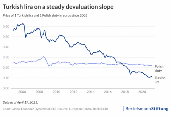 Ανεξάρτητα από το πόσο υψηλός είναι στην πραγματικότητα ο πληθωρισμός: ο κύριος λόγος για τη ραγδαία αύξηση των τιμών είναι η αδύναμη λίρα. Κάνει τις εισαγωγές -όπως τις πρώτες ύλες- πολύ ακριβότερες. Η επιθυμία του Ερντογάν για χαμηλά επιτόκια βασίζεται στον υπολογισμό της ενίσχυσης της οικονομικής ανάπτυξης-η φθηνή πίστωση ενθαρρύνει περισσότερη κατανάλωση ,τις επενδύσεις και τις εξαγωγές, αφού τα προϊόντα γίνονται φθηνότερα στην παγκόσμια αγορά. Ενα αδύναμο νόμισμα κάνει επίσης τις διακοπές των ξένων στη χώρα, πιο ελκυστικές.