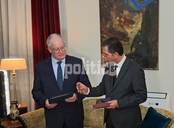 Στη συνέχεια, ο Υφυπουργός Εσωτερικών ξενάγησε τον κ. Τασούλα στην Έκθεση, παρουσιάζοντάς του με λεπτομέρεια τα εκθέματα και αναδεικνύοντας την ιστορική τους αξία. Κατά τη διάρκεια της επίσκεψης, ο κ. Γκιουλέκας προσέφερε στον Πρόεδρο της Βουλής ένα ακριβές αντίγραφο του Πρωτοκόλλου Απελευθέρωσης της Θεσσαλονίκης, καθώς και πιστό αντίγραφο της σφραγίδας της Φιλικής Εταιρείας. Τα ίδια αναμνηστικά δώρα προσφέρθηκαν και στις κυρίες Ναταλία Ιωαννίδου Μελά και Λέλα Καραγιάννη.