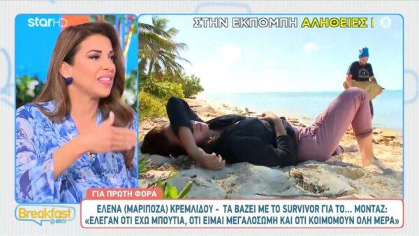 «Υπάρχει πλάνο που είμαι όντως ξαπλωμένη με κλειστά τα μάτια και έλεγαν: η Έλενα κοιμάται. Κι εγώ ήμουν πρησμένη και κατακόκκινη από την ηλίαση. Το μοντάζ κάνει θαύματα», καταλήγει επί του θέματος η Έλενα Κρεμλίδου για τη συμμετοχή της στο Survivor.