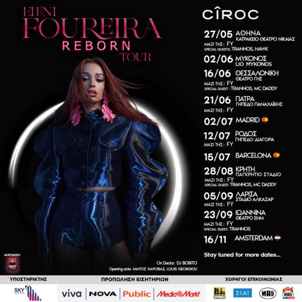 Τους επόμενους μήνες, η Ελένη Φουρέιρα θα ξεσηκώσει με το «Reborn Tour» πολλές περιοχές της Ελλάδας, αλλά και χώρες όπως η Ισπανία και η Ολλανδία. Στις συναυλίες της σε όλη την Ελλάδα θα είναι μαζί της ο FY, ενώ σε κάποιες από αυτές θα υπάρχουν guests – έκπληξη.