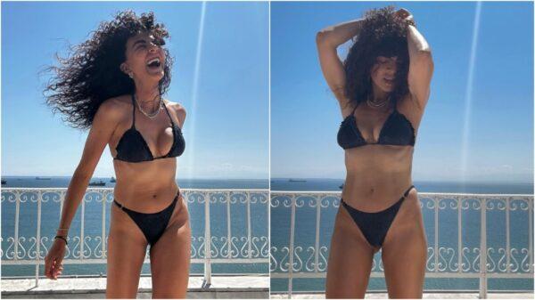 Ωστόσο, αυτό δεν την εμπόδισε να φορέσει το μαύρο μπικίνι μαγιό της και να ποζάρει για τους ακόλουθούς της στο Instagram από το μπαλκόνι.
