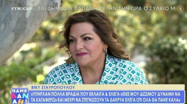 Μια εφ’ όλης της ύλης συνέντευξη στον Άρη Καβατζίκη παραχώρησε η Βίκυ Σταυροπούλου το πρωινό της Τετάρτης στην εκπομπή «Πάμε Δανάη» στο MEGA. Μέσα σε όλα, η αγαπημένη ηθοποιός αναφέρθηκε στις δύσκολη διαχείριση της απώλειας των αγαπημένων της προσώπων δίχως να μπορεί να συγκρατήσει τα δάκρυα της για τον πρόωρο χαμό του αδελφού της.