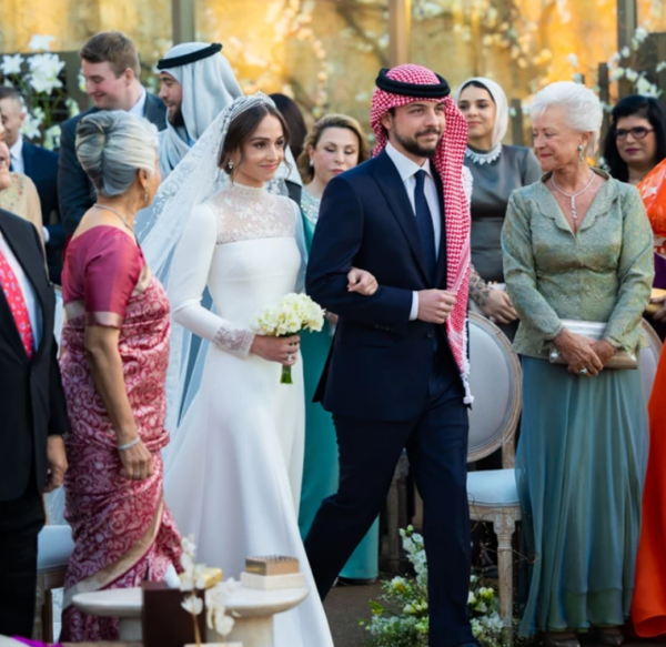 Η πριγκίπισσα Ιμάν, η οποία είναι 26 ετών, έφτασε στο σημείο της τελετής φορώντας ένα λευκό φόρεμα με δαντελένιο πέπλο, συνοδευόμενη από τον αδελφό της, διάδοχο του θρόνου, Χουσεΐν. Το νυφικό της είχε ψηλό λαιμό και μακριά μανίκια, ενώ ήταν μάξι και κατέληγε σε μακριά ουρά. Τα καστανά μακριά μαλλιά της ήταν πιασμένα σε έναν όμορφο κότσο ενώ ολοκλήρωσε την εμφάνισή της με μια διαμαντένια τιάρα (την οποία φορούσε και η μητέρα της στον γάμο της) και ένα τεράστιο πέπλο, κεντημένο με περίπλοκα λουλούδια. Όσο για τη νυφική ανθοδέσμη, η πριγκίπισσα κράτησε ένα πολύ απλό μπουκέτο με λευκά λουλούδια.