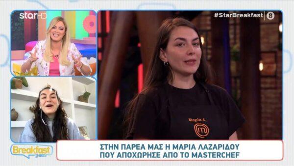 Με αφορμή την αποχώρηση από το MasterChef, η Μαρία Λαζαρίδου μίλησε ζωντανά το πρωινό της Τρίτης στον αέρα της εκπομπής Breakfast@Star με την Ελένη Χατζίδου και τον Ετεοκλή Παύλου. Μάλιστα, η όμορφη διαγωνιζόμενη του ριάλιτι μαγειρικής μίλησε για την δεύτερη εμπειρία στον διαγωνισμό, την αποχώρηση και την Μαρία Μπέη.