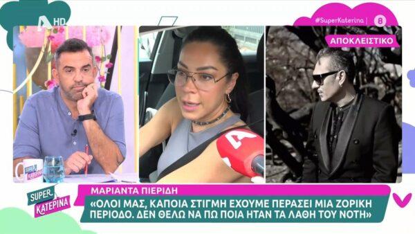 «Όλοι μας έχουν περάσει κάποια στιγμή μία ζόρικη περίοδο. Για τον ίδιο παραβγήκε στη δημοσιότητα. Δεν θέλω να πω εγώ ποιο ήταν το σωστό και ποιο το λάθος σε αυτά που έχει δηλώσει ή έχει κάνει», τονίζει αμέσως μετά η Μαριάντα Πιερίδη.