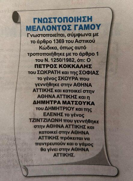 «Γνωστοποιείται σύμφωνα με το άρθρο 1369 του Αστικού Κώδικα, όπως αυτό τροποποιήθηκε με το άρθρο 1 του Ν. 1250/1982 ότι: Ο Πέτρος Κόκκαλης του Σωκράτη και της Σοφίας, το γένος Σκούρα που γεννήθηκε στην Αθήνα Αττικής και κατοικεί στην Αθήνα Αττικής και η Δήμητρα Ματσούκα του Δημητρίου και της Ελένης, το γένος Τζιντζιλιώνη που γεννήθηκε στην Αθήνα Αττικής και κατοικεί στην Αθήνα Αττικής, πρόκειται να παντρευτούν και ο γάμος θα γίνει στην Αθήνα Αττικής», αναφέρει.