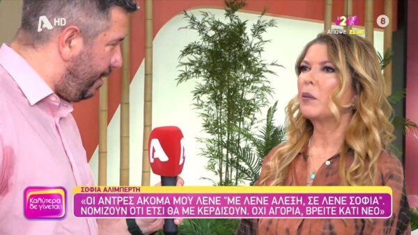Η Σοφία Αλιμπέρτη έκανε το δικό της τηλεοπτικό comeback φέτος μετά από 14 ολόκληρα χρόνια, παρουσιάζοντας την καθημερινή εκπομπή «Ζήσε αλλιώς» στον ΑΝΤ1. Μιλώντας στην κάμερα του «Καλύτερα δε γίνεται» και τον Χάρη Λεμπιδάκη, η παρουσιάστρια αναφέρθηκε στην περίοδο της αποχής της, στα νούμερα τηλεθέασης, ενώ παράλληλα απαντά για το τηλεοπτικό της μέλλον.