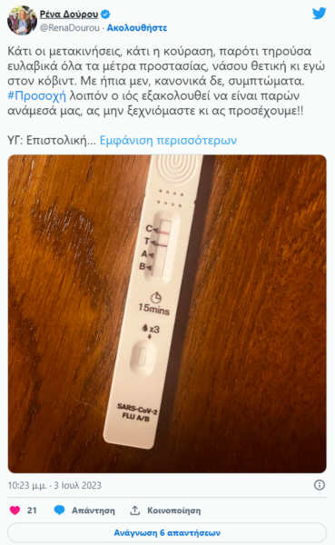 «Κάτι οι μετακινήσεις, κάτι η κούραση, παρότι τηρούσα ευλαβικά όλα τα μέτρα προστασίας, νάσου θετική κι εγώ στον κόβιντ. Με ήπια μεν, κανονικά δε, συμπτώματα.