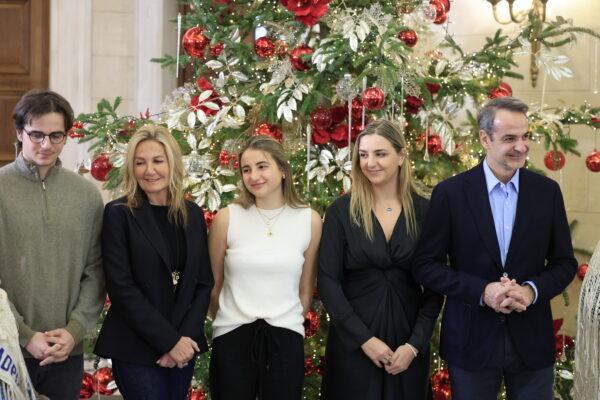 Ο Κυριάκος Μητσοτάκης μαζί με τη σύζυγό του Μαρέβα και τα τρία τους παιδιά Κωνσταντίνο, Σοφία και Δάφνη άκουσαν τα κάλαντα του συλλόγου ενώ δεν έλειψαν και οι μαντινάδες.