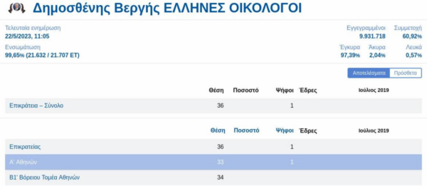 Μόλις μία ψήφο έλαβε η παράταξη «Έλληνες Οικολόγοι» του Δημοσθένη Βεργή η οποία μάλιστα δεν ήταν καν δικιά του!