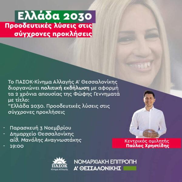 «Την επόμενη Παρασκευή 3 Νοεμβρίου, το ΠΑΣΟΚ Κίνημα Αλλαγής Θεσσαλονίκης διοργανώνει πολιτική εκδήλωση προς τιμήν της Φώφης Γεννηματά, με κεντρικό ομιλητή τον Pavlos Christidis.