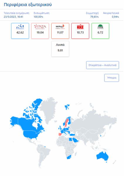 ΝΔ «δαγκωτό» ψήφισαν και οι Έλληνες του εξωτερικού, με τον παγκόσμιο χάρτη να βάφεται ως επί το πλείστον μπλε.