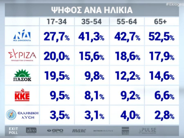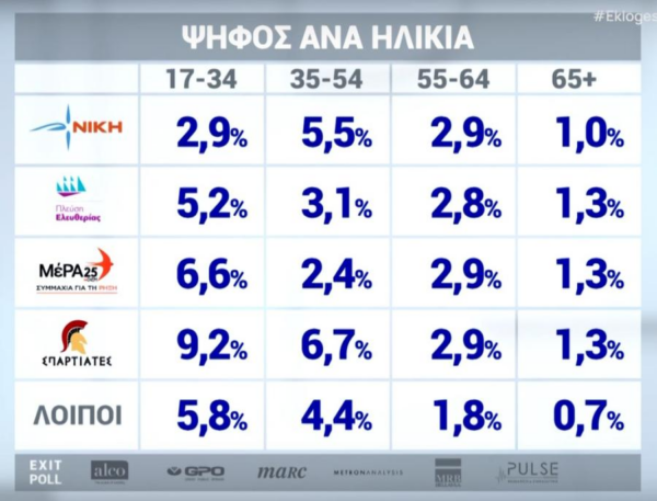 Αναλυτικά τα ποσοστά των κομμάτων ανά ηλικιακή ομάδα σύμφωνα με τα στοιχεία του exit poll.