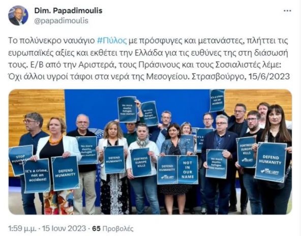 Tweet στο οποίο κατηγόρησε την Ελλάδα έκανε σήμερα ο αντιπρόεδρος του ευρωπαϊκού κοινοβουλίου και ευρωβουλευτής του ΣΥΡΙΖΑ – ΠΣ Δημήτρης Παπαδημούλης ο οποίος φωτογραφήθηκε μαζί με ευρωβουλευτές της Αριστεράς, των Πρασίνων και των Σοσιαλιστών μεταξύ των οποίων και ο Κώστας Αρβανίτης και η Ελένη Κουντουρά κρατώντας αφίσες με το μήνυμα «όχι άλλοι θάνατοι. Οι ζωές των προσφύγων έχουν αξία».