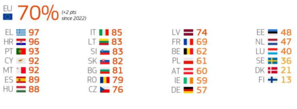 Το ποσοστό που, σχεδόν, αγγίζει το 100% έχει μεγάλη διαφορά από το γενικό ποσοστό σε επίπεδο ΕΕ, με το 70% των πολιτών (μέσος όρος) που ρωτήθηκαν να θεωρεί ότι η διαφθορά είναι ευρέως διαδεδομένη στο κράτος μέλος τους.