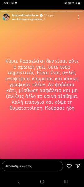 Μέσω Instagram, ο Λάμπρος Κωνσταντάρας έγραψε:«Κύριε Κασσελάκη δεν είσαι ούτε ο πρώτος γκέι, ούτε τόσο σημαντικός. Είσαι ένας απλός υποψήφιος κόμματος και κάπως γραφικός πλέον.Αν φοβάσαι κάτι, μίσθωσε ασφάλεια και μη ζαλίζεις άλλο το κοινό αίσθημα. Καλή επιτυχία και κόψε τη θυματοποίηση. Κούρασε ήδη».