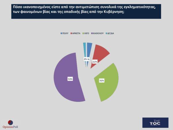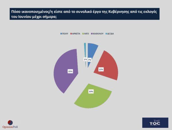 Πολύ και αρκετά κανοποιημένοι από το συνολικό έργο της Κυβέρνησης δηλώνει το 30.1%, λίγο ικανοποιημένοι το 29.9% και καθόλου ικανοποιημένοι το 38.9%.