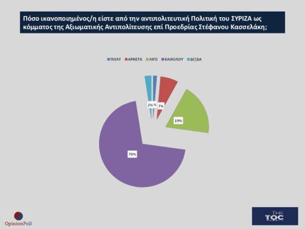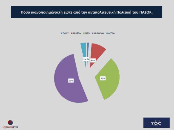 Αν και ικανοποιημένοι από το κυβερνητικό έργο δηλώνει το 30.1%, επίδοση όχι υψηλή, είναι πολύ πιο χαμηλά τα επίπεδα ικανοποίησης από την αντιπολιτευτική πολιτική του ΣΥΡΙΖΑ και του ΠΑΣΟΚ. Για τον ΣΥΡΙΖΑ η ικανοποίηση είναι μόλις 8.1% ( πολύ και αρκετά) ενών ακόμα και μεταξύ των ψηφοφόρων του ΣΥΡΙΖΑ ικανοποιημένοι δηλώνουν μόλις το 19.4%.