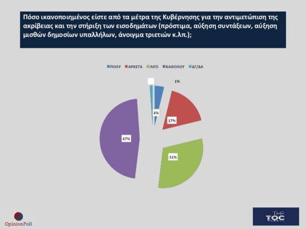 - Υπάρχει χαμηλή ικανοποίηση από τα μέτρα της κυβέρνησης για την αντιμετώπιση της ακρίβειας και την στήριξη των εισοδημάτων με την ικανοποίηση να φτάνει μόλις το 21.2% ενώ λίγο και καθόλου ικανοποιημένοι δηλώνουν το 77.7%.