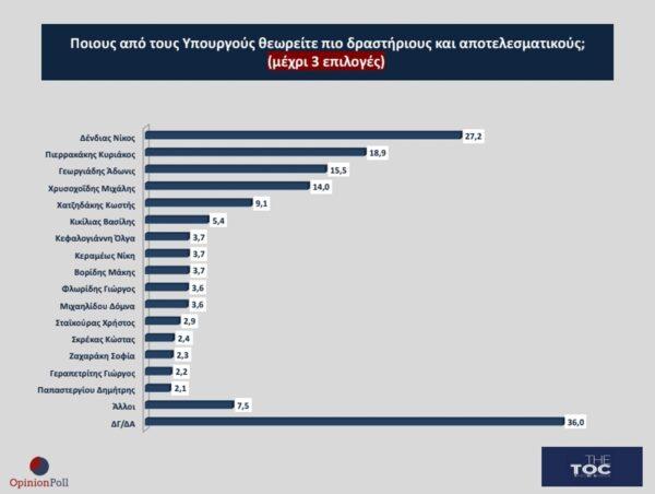 Στην πρώτη πεντάδα βρίσκονται ο Νίκος Δένδιας με 27.2%, ο Κυριάκος Πιερρακάκης με 18.9%, ο Άδωνις Γεωργιάδης με 15.5% , ο Μιχάλης Χρυσοχοίδης με 14% και ο Κωστής Χατζηδάκης με 9.1%.