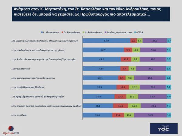 Ο Πρωθυπουργός προηγείται συντριπτικά έναντι του Σ. Κασσελάκη και του Ν.Ανδρουλάκη στην δυνατότητα διαχείρισης όλων των κρίσιμων θεμάτων για τα οποία υπήρχε ερώτηση. Δηλαδή σε όλα τα θέματα, από την εξωτερική πολιτική και την Οικονομία, έως το μεταναστευτικό, την εγκληματικότητα ή την Παιδεία, ο Κυριάκος Μητσοτάης θεωρείται καλύτερος διαχειριστής από τους αντιπάλους του.