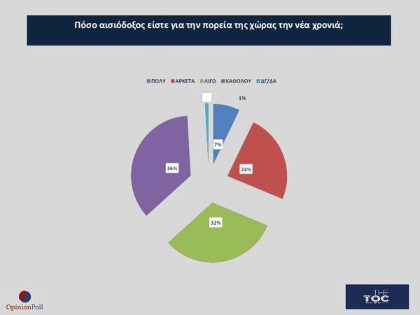 - Υπάρχει μια απαισιοδοξία για την πορεία της χώρας τη νέα χρονιά, κλίμα απαισιοδοξίας που εκφράζεται από τη μεγάλη πλειοψηφία του πληθυσμού, δηλαδή το 67.8% , ενώ αισιόδοξοι εμφανίζονται το 31.3%.